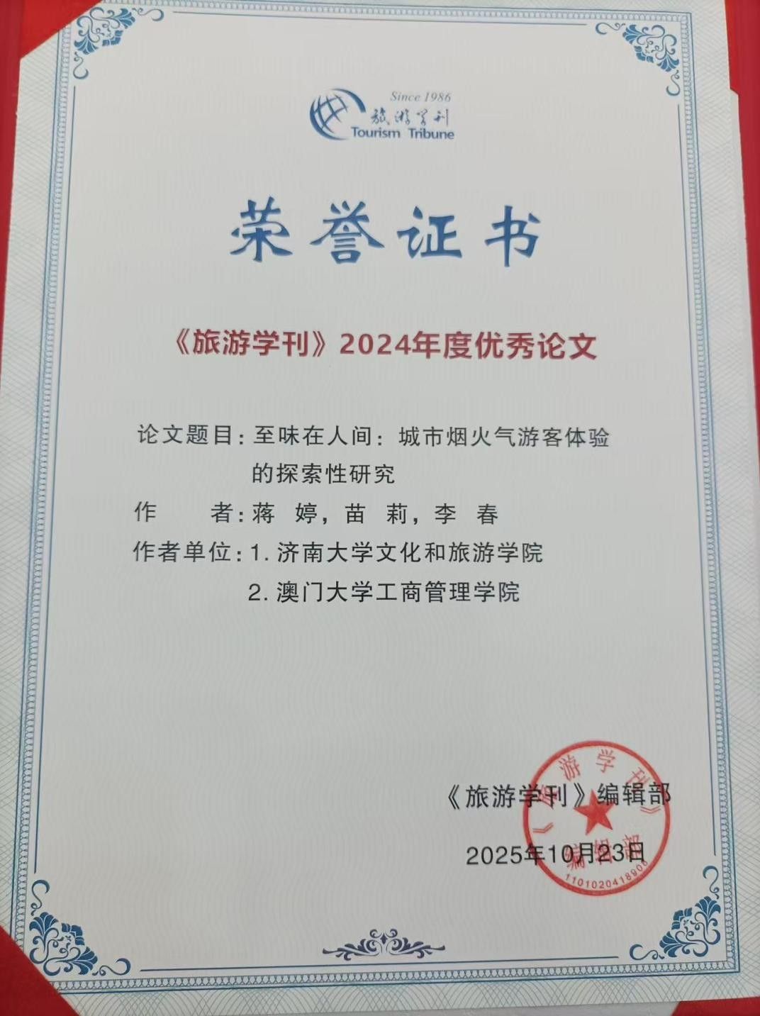 近日,在西安结束的2025《旅游学刊》中国旅游研究年会上,由编委组成的论文评审委员会多轮评选,遴选出2024年《旅游学刊》年度优秀论文10篇。太阳城赌场蒋婷教授和其研究团队撰写的论文《至味在人间:城市烟火气游客体验的探索性研究》,被评为2024《旅游学刊》年度优秀论文。