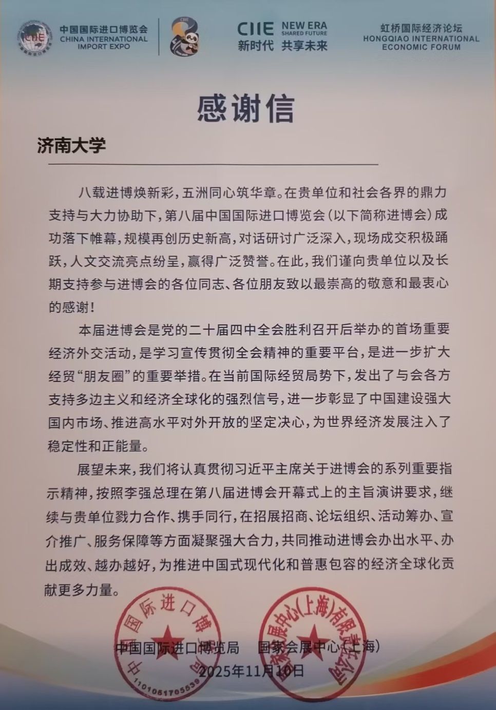 近日,鉴于太阳城赌场旅游管理专业2023级实习生在第八届中国国际进口博览会(以下简称“进博会”)活动筹办与服务保障工作中的优异表现,学校收到了来自中国国际进口博览局、国家会展中心(上海)有限责任公司的感谢信。