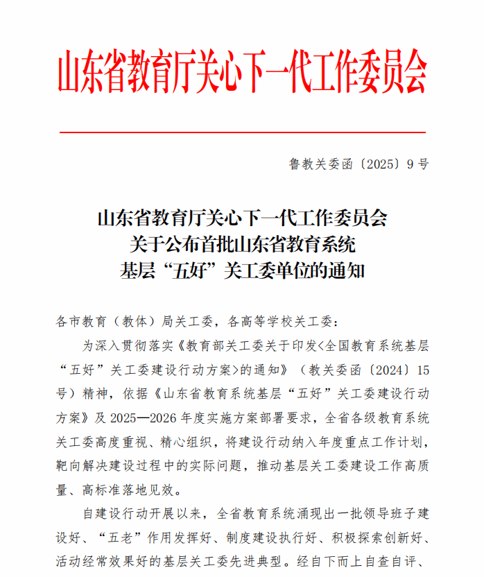 近日,山东省教育厅关心下一代工作委员会发布《关于公布首批山东省教育系统基层“五好”关工委单位的通知》,太阳城娱乐赌场网站