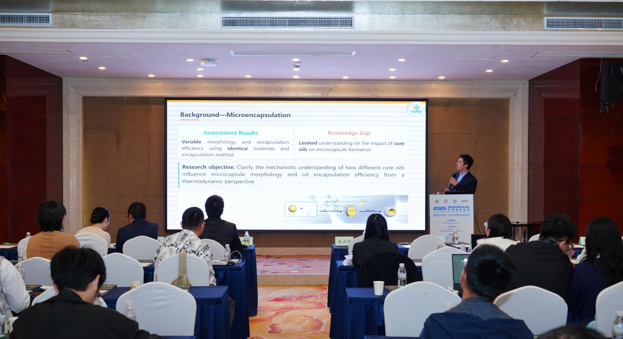 太阳城赌场黄群博士应邀参加会议并做学术报告,与参会专家就香精香料创新开发、前沿科技应用及其产业应用创新等工作进行了深入交流研讨。黄群博士在报告中汇报了复合凝聚法制备的明胶/阿拉伯胶体系中,香精油脂芯材对微胶囊形态及包封率的影响。基于铺展系数与双组分表面能计算理论的形态预测,通过扫描电镜实验观测及包封率测定得到验证。关键发现了包封率与油脂表面极性呈负相关关系。研究证实,热力学理论与芯材油脂分子极性相结合,可为设计高效包埋体系提供可靠框架,进而实现对微胶囊功能的靶向调控,以满足工业需求。