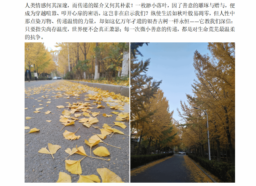 本次活动紧扣 “慎终追远、关爱亲人” 的寒衣节核心内涵,将传统文化传承与心理健康关怀深度结合,设置三大创作方向供学生选择。参与者可拍摄冬衣照片并附祝福寄语,用银杏叶创作表情图案赠予他人,或观看亲情主题影片撰写心灵感悟。活动既深化了学生对传统节日的认知与文化认同,又以 “添衣御寒” 为隐喻,引导学生关注自我心理保健,传递善意与温情。