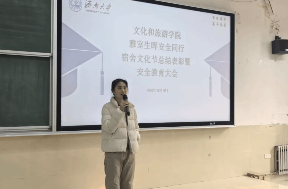 于12月19日上午在舜耕校区D4JJT教室举行“雅室生晖,安全同行”宿舍文化节总结表彰暨安全教育大会。学院党委副书记、副院长信苏珊,学院全体辅导员以及主要学生干部、宿舍舍长和学生代表共同参加了本次大会。活动由学院学办主任吕龙飞主持。