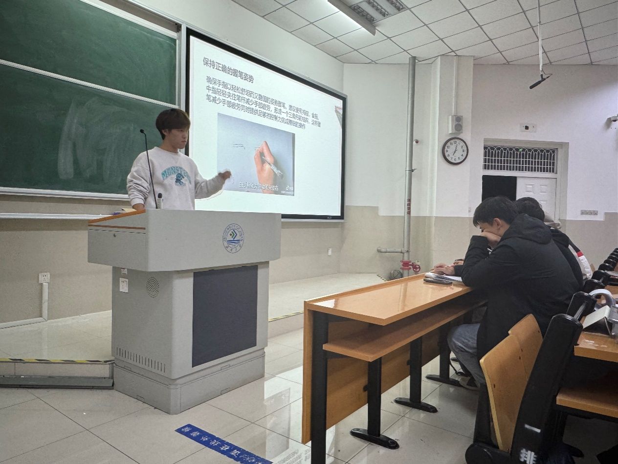 活动中,主讲人李青雨同学以汉字书写为主题展开分享。他详细阐述了写字的益处,指出写字不仅能够锻炼耐心与专注力,还能提升个人的文化修养与审美水平。李青雨同学结合自身经验,向同学们介绍了汉字书写的基本方法,包括正确的握笔姿势以及字体结构的把握等,并通过播放相关视频资料,生动形象地帮助同学们理解汉字书写的要点与精髓。