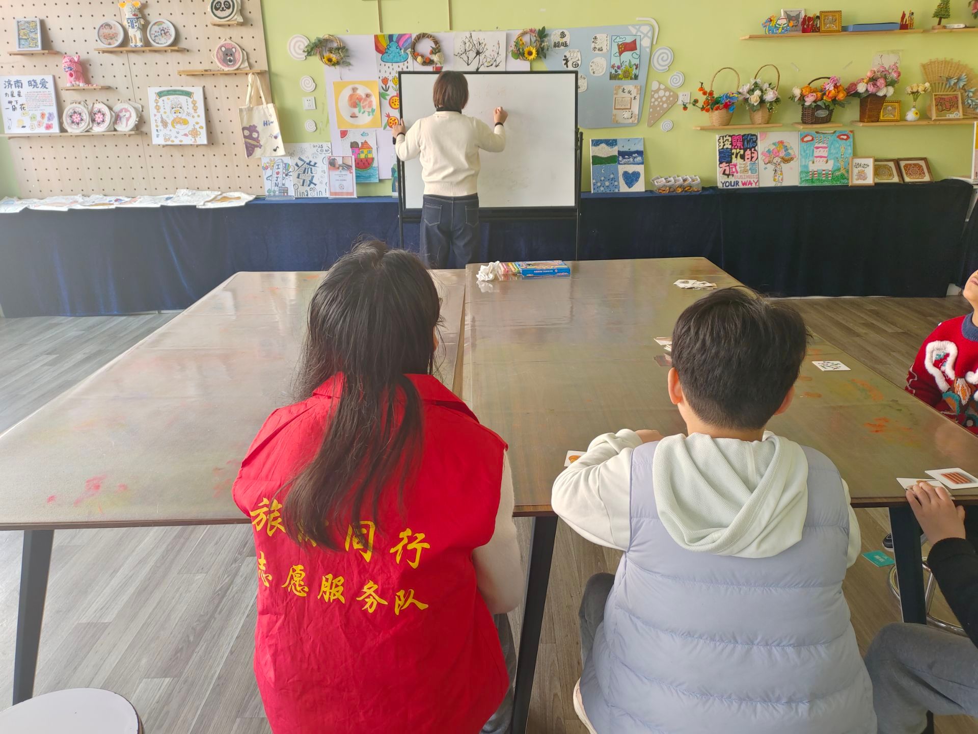 告别刻板的教学模式,志愿者们化身“童心引路人”,带着色彩斑斓的教具走进课堂。数字与图形不再是枯燥的符号,而是通过趣味问答、情景模拟变得鲜活起来;看图识物卡片上的动物、水果与生活用品,在志愿者耐心的引导下,成为孩子们认识世界的窗口。“孩子们专注的眼神里,藏着对未知的好奇,也让我们读懂了陪伴的意义。”志愿者许莉的话语里满是动容。在轻松愉悦的氛围中,知识悄然萌芽,信任慢慢滋生,每一次回应都是心与心的靠近。
