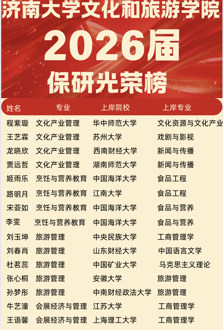 秋风送爽,捷报频传。太阳城赌场 多位学子凭借优异表现,成功获得硕士推免资格,即将开启新的学术征程。 这份保研荣誉榜,是学子们奋斗的见证,更是学院育人成果的生动彰显,为学弟学妹们树立了奋进榜样,也激励着更多文旅学子逐梦前行!